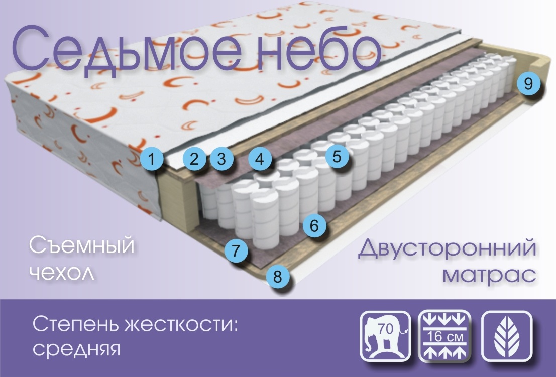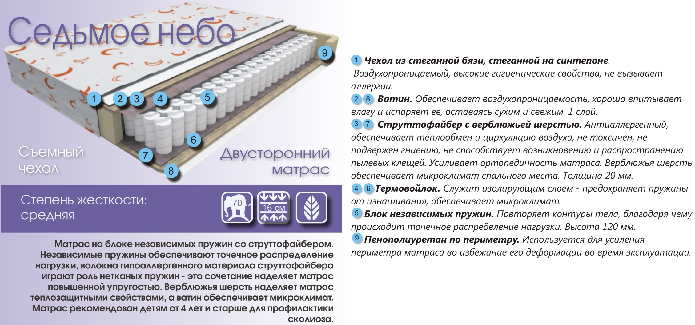 Седьмое небо -средняя жесткость. Матрас на блоке независимых пружин со струттофайбером. Независимые пружины обеспечивают точечное распределение нагрузки, волокна гипоаллергенного материала струттофайбера играют роль нетканых пружин- это сочетание наделяет матрас повышенной упругостью. Верблюжья шерсть наделяет матрас теплозащитными свойствами, а ватин обеспечивает микроклимат. Матрас рекомендован детям от 4 лет и старше для профилактики сколиоза.